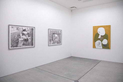 岩名泰岳は故郷である三重県の村の生活や過疎化の手触りのようなものを抽象的な油彩画で描いてきました。松元悠は実際に起きた事件の取材を重ね、当事者の追体験を試みるような緻密で幻想的なリトグラフ作品を制作しています。絵画(油彩画)と版画(リトグラフ)、筆致と印刷、抽象とリアリズムなど、両者の作品は一見するととても対照的に映るかも知れませんが、その制作過程からは”人々の生活を美術で記録する”という共通の姿勢を見出すことができます。また、村の堆肥工場の従業員と壁画の共同制作を行う岩名と法廷画家として裁判の様子を記録する松元からは既存の美術制度から一歩外れた場所に赴いて制作実践を行うという独自の活動にも注目することができます。